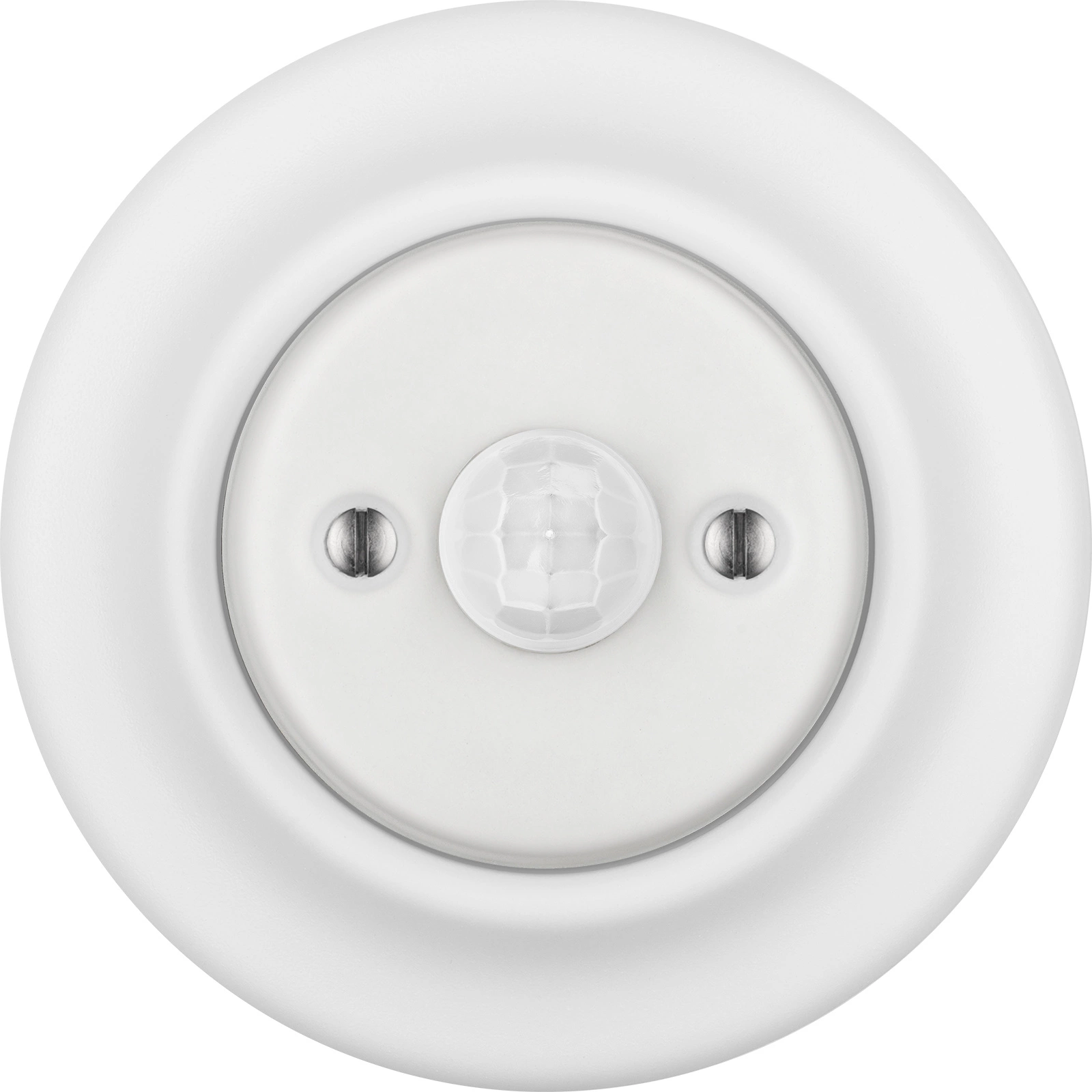 Sensor de movimento inspirada no design retro, com superfície branca fosca. Altamente resistente à abrasão e à poeira. Certificado CE de conformidade. Tampa decorativa. Garantia de 50 anos!