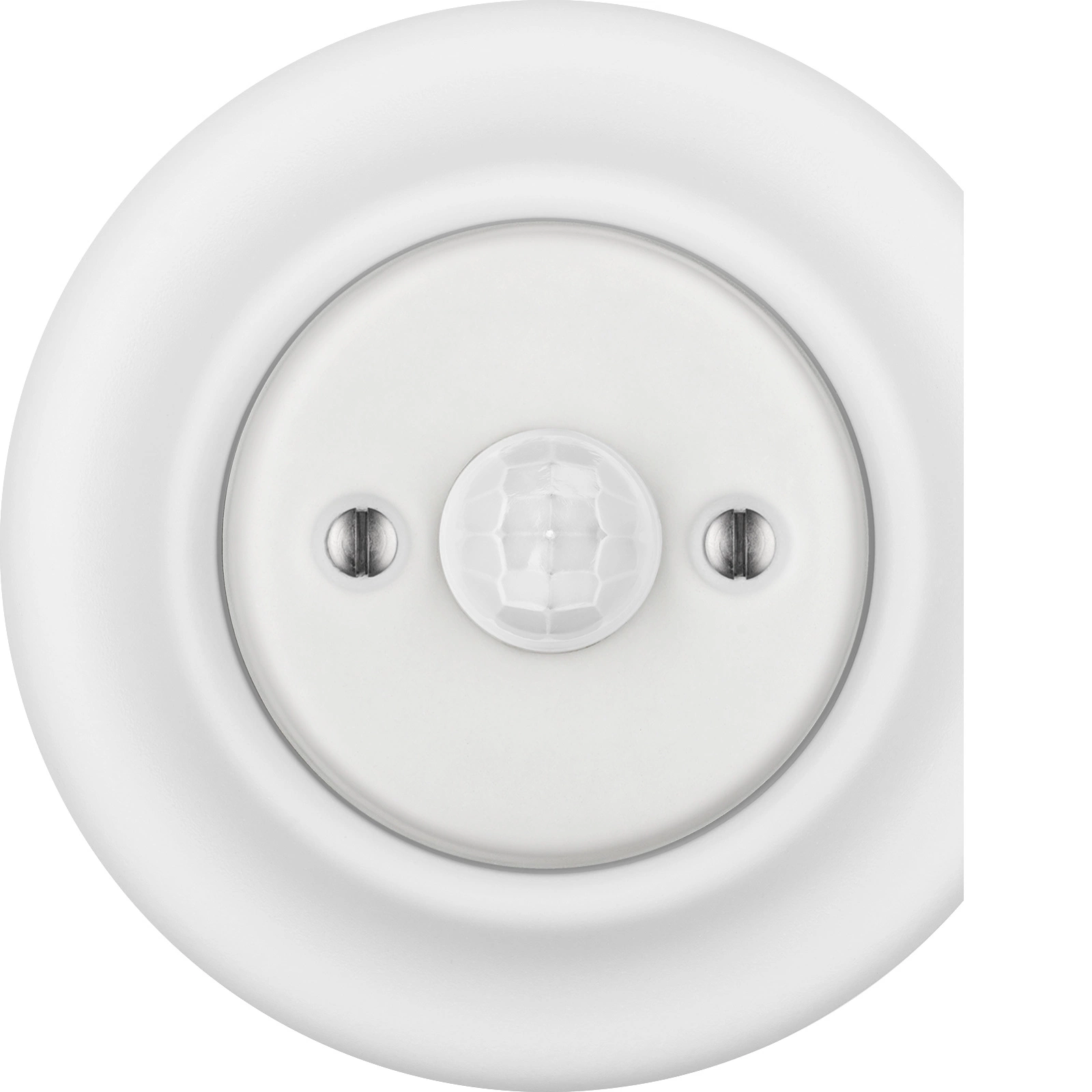 Sensor de movimento inspirada no design retro com superfície branca fosca. Altamente resistente à abrasão e à poeira. Certificado CE de conformidade. Tampa decorativa. Garantia de 50 anos!